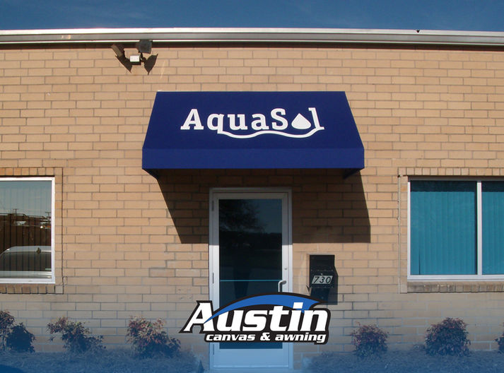 Austin Canvas & Awning recently installed a custom blue fabric awning for AquaSol, featuring a straight slope design with custom graphics. This awning enhances the storefront’s appeal while providing shelter. Trust us for high-quality, tailored solutions to elevate your property with style and functionality.