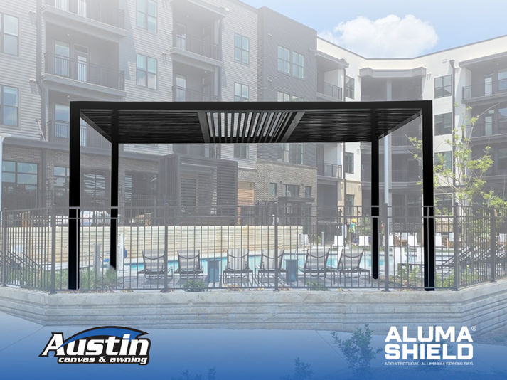 Austin Canvas & Awning, in collaboration with Concorde Construction, installed an Aluma Shield® 4-sided post and beam aluminum trellis at Wilkinson & Berryhill. Powder-coated in RAL Graphite Black, this trellis offers shade and style, showcasing the versatility and craftsmanship of our Aluma Shield® products.